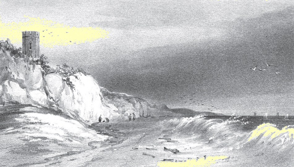 The whole site of ancient Cromer [33a] now forms part of the German Ocean, the inhabitants having gradually retreated inland to the present situation, from whence the sea still threatens to dislodge them. The locality of this portion of the coast, the scarcity of sea beach material in the offing, the bed of the ocean of a rocky character, and the beach presenting nearly a level approaching a dead flat render it peculiarly liable to its invasion.