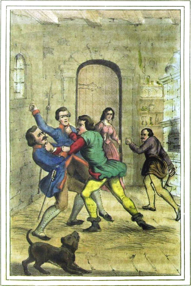 In der Vorhalle des Schlosses stand Josephine hinter einer Säule des hohen Gewölbes, furchtsam auf den Hof hinausblickend, und mit Grauen die fremden Gestalten betrachtend, deren wilde Gesichter aus der dunkeln Flammengluth der Fackeln noch wilder hervortraten. Sie hörte den Befehl des Grafen, den Anführer der Bande in[S. 436] das sicherste Gefängniß zu bringen; sie warf einen scheuen Blick auf ihn. Josephine schauderte zusammen und ein entsetzlicher Schrecken durchzuckte sie, denn das war das Gesicht ihres Philipps, das war sein Gang, seine Haltung.