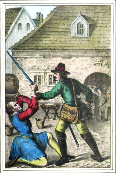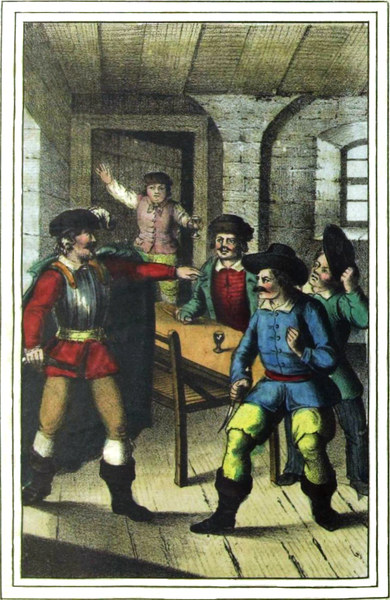 Es entstand nun darüber ein Streit, bis der Fremde, den dieses Gezänke auf die Länge der Zeit langweilte, sich verabschiedete und die Schenke verließ, um ruhig seinen Weg weiter fortzusetzen.