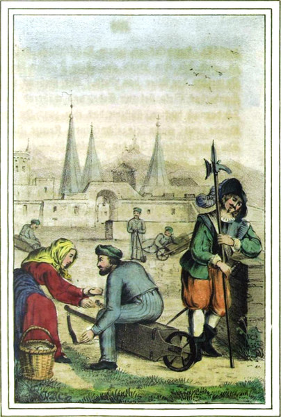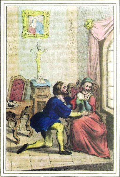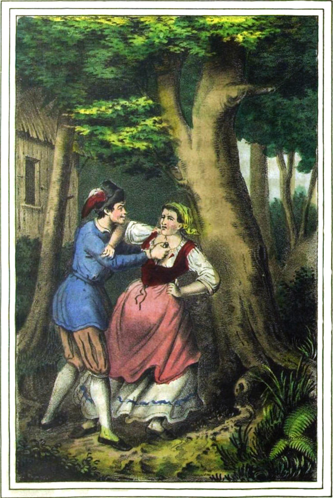 Mit Abscheu bebte die Tugendhafte vor dem[S. 431] Kuppler des lüsternen Gebietes zurück, doch schauderte sie zusammen, als der Gerichtsbeamte aus dem Tone der feinsten Schmeichelei in den einer kalten Härte überging, ihr schonungslos eine Bedenkzeit nur bis zum folgenden Tag zugestand und im Falle ihrer hartnäckigen Weigerung, die Rückkehr in eine vieljährige Gefangenschaft bei Wasser und Brod, ein gräßliches Leben bei Grabesstille, auf faulendem Stroh, in Gesellschaft von Unken und Gewürme, ankündigte.