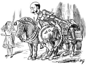 Alice certainly was; the Knight was riding rather uncomfortably on a sober-paced horse that was prevented from moving any faster by an elaborate housing of red-tape trappings. “Of course, I see the reason for that,” thought Alice; “if it were to move any quicker the Knight would come off.” But there were{13} a number of obsolete weapons and appliances hanging about the saddle that didn’t seem of the least practical use.