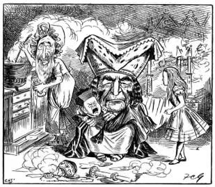 The atmosphere was as noticeable as the noise when Alice got in, and seemed to be heavily charged with pepper. There was a faint whiff of burning incense, and some candles that had just been put out were smouldering unpleasantly. Quite a number of Articles were strewn about on the floor, some of them more or less broken. The Duchess was seated in the middle of the kitchen, holding, as well as she could, a very unmanageable baby that kept wriggling itself into all manner of postures and uncompromising attitudes. At the back of the kitchen a cook was busily engaged in stirring up a large cauldron, pausing every now and then to fling a reredos or half a rubric at the Duchess, who maintained an air of placid unconcern in spite of the combined fractiousness of the baby and cook and the obtrusiveness of the pepper.{18}