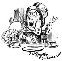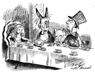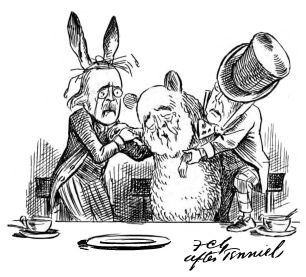 The March Hare and the Dormouse and the Hatter were seated at a very neglected-looking tea-table; they were evidently in agonised consideration of something—even the Dormouse, which was asleep, had a note of interrogation in its tail.