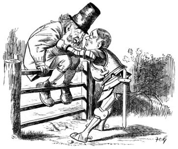 At this moment the horse suddenly went on again, and the Knight clutched convulsively at its mane to prevent himself from coming off.
