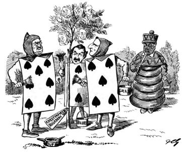 With apologies to Sir John Tenniel and to everybody else concerned, including Messrs. Macmillan and Co., Limited, to whose courtesy we are indebted for permission to publish these political applications of the immortal adventures of Lewis Carroll’s Alice.