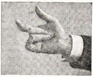 The beginner is apt to try to have his hand appear perfectly flat when seen from the back; but let him notice the open hand of a friend as it hangs in a normal condition, and he will find that it is slightly arched. Supposing that my reader is now an adept at palming, let us proceed with "The Miser" as Herrmann did it.