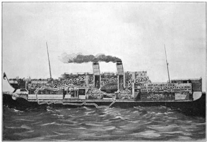 “Double hulls extending well above the water line are the only safeguard for the ship, and individual unsinkable garments for the passengers their only certain protection,” Mr. MacGregor said. “I knew the Empress of Ireland. She was of the same construction type as the Titanic. She, and practically every other, except four of the largest passenger steamships out of New York, has only a double shell far below the water line, a protection only from damage about the keel. It cost more than $1,000,000 to reconstruct with a double hull one of the biggest transatlantic service steamships after the [Pg 317] Titanic went down. The expense and great reduction of cargo capacity have been a bar to general adoption of that type.