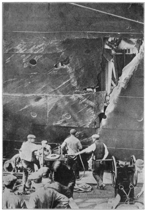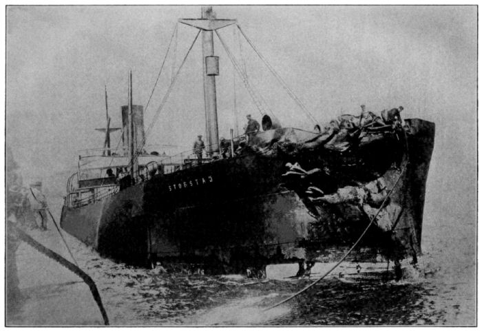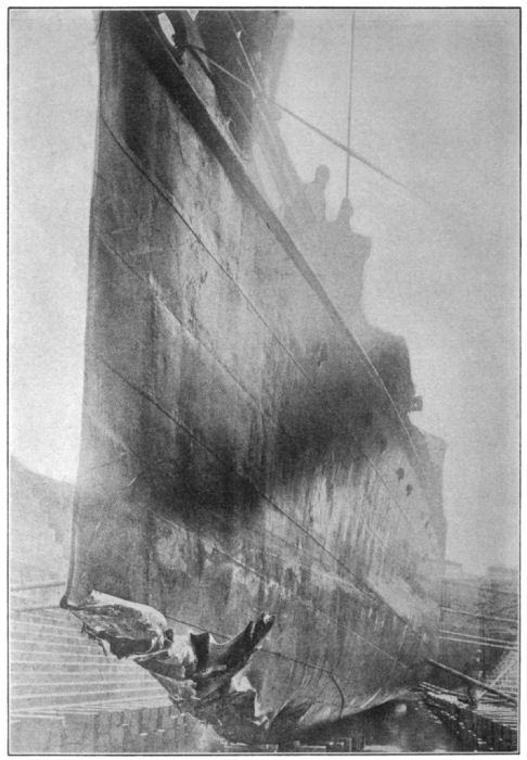 “A side-wiping blow delivered by such a vessel as the Storstad would sink almost any vessel, though I am inclined to [Pg 315] think that the heavy scantlings of large vessels like the Lusitania, the Imperator, or the Vaterland, would break off the stem of a vessel so much smaller and so localize the damage.