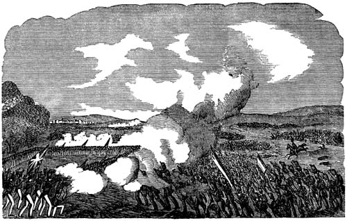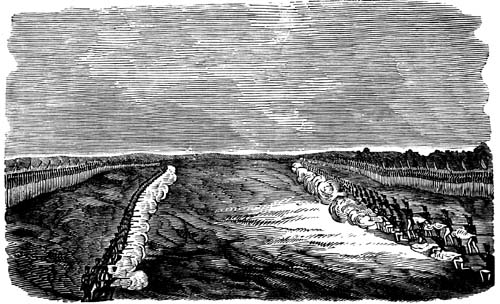 The night of the 17th was ushered in by a violent storm of wind and rain. It was extremely dark and uncomfortable; but, as the loud roar of the tempest would effectually drown the noise of the pick-axes, eighteen hundred men were ordered to break ground only one hundred and sixty yards from the Picurina. They were accompanied by a guard of two thousand men. So rapidly did they work, that, though it was late when they commenced, before morning they had[167] completed a communication four thousand feet in length, and a parallel six hundred yards long, three feet deep, and three wide. The next night these works were enlarged, and two batteries traced out. To destroy these works was now the first object of the besieged. On the 19th, thirteen hundred of their number stole out of the city, unobserved, into the communication, and began to destroy the parallel. They were soon discovered, however, and driven away. As they rode up, part of the French cavalry entered into a mock contest, giving the countersign in Portuguese, and were thus permitted to pass the pickets; but they soon betrayed their real character, and our troops, hastily seizing their arms, drove them back to the castle, with a loss of three hundred men. One hundred and fifty of the British fell, and, unfortunately, Colonel Fletcher, the chief engineer, was badly wounded. Owing to this circumstance, and the continued wet and boisterous state of the weather, the works advanced slowly; but the batteries were at length completed. Owing to the heavy rains, the parallel remained full of water, and it was found impossible to drain it. But this was in some degree remedied by making an artificial bottom of sandbags. One place yet remained, on the right bank of the Guadiana, which Wellington had not invested. The eagle eye of Phillipon soon perceived his advantage. He erected here three batteries, which completely swept our works with a most destructive fire; and its effect would have been yet greater, had[168] it not been that the mud obstructed the bound of the bullets. A courier was instantly despatched to the fifth division, stationed at Campo Mayor, for assistance. But misfortunes seldom come alone. The heavy rains had caused such a rise in the river, that the flying bridges were swept away, and the trenches filled with water. The provisions and ammunition of the army were still on the other side of the river, so that we were soon in want of both. To add to this, the earth thrown up for intrenchments became so saturated with water that it crumbled away, and our labors were for the time wholly suspended. A few days of fine weather, however, relieved us from our unpleasant situation. The river subsided, another flying bridge was constructed and row-boats obtained, so that the communication might not again be interrupted, under any circumstances. On the 25th the reinforcement from Campo Mayor arrived, and the right bank of the Guadiana was immediately invested. The same day, our batteries were opened upon the fort. The enemy were by no means silent spectators of this invasion. They returned our fire with such vigor, that several of our guns were dismounted, and quite a number of officers killed. Marksmen were also stationed on the trenches, to shoot every one who should show his head over the parapet.