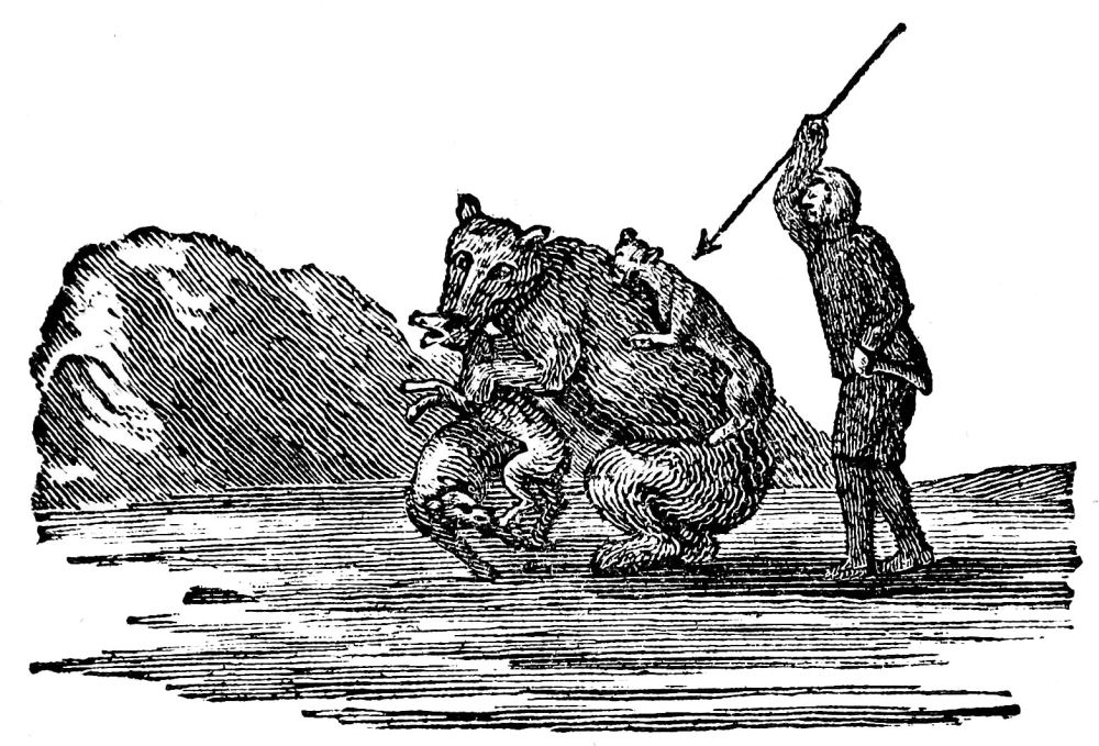 [41] Others say, that a huge dog watches the entry, and gives warning, when an angekkok attempts to get in, and defends the entry. Wherefore the angekkok must watch the minute, that the dog falls asleep (which lasts but a moment), to steal in upon her. This moment nobody knows but an angekkok poglik; wherefore the other angekkuts often return home again without success. This frightful woman is said to have a hand as big as the tail of a whale, with which, if she hits any body, he is at one stroke mouse-dead. But if the angekkok conquers her (which he does if he can get at her aglerrutut, which hang dangling about her face, and rob her of them) then she must discharge all fishes and sea animals, which she has detained in captivity; who thereupon return to their wonted stations in the sea.