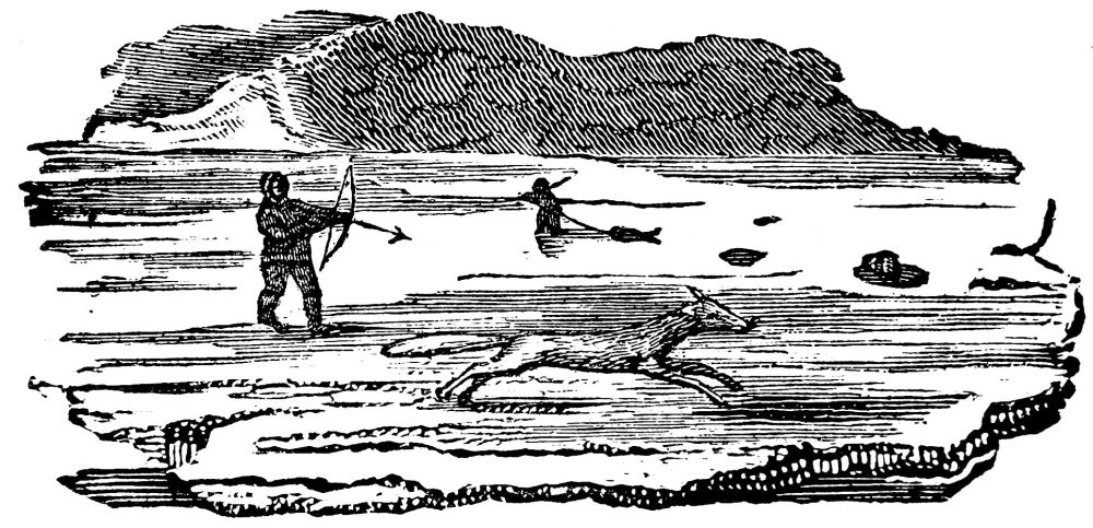 [28] The farther you go Northwards, the seldomer you meet with rein deer, except in the 3d or 4th degree to the North of Disco, where they are in great numbers; perhaps by reason either of its joining to America, or else because the deer pass over to the islands upon the ice, in quest of food, which the main land, covered with ice and snow, does not afford them. The natives, instead of reason, give us a very childish tale for the vast number of rein deer being found upon Disco Island, as follows:—