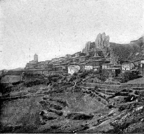 El panorama, que hiere los ojos desde el pretil de la iglesia, no puede ser más romántico y a la vez más triste y desolado. Más que abrigo de rudos y alegres aldeanos, parece aquello lugar de expiación y de castigo. Según mostramos en el adjunto grabado, una gran montaña, áspera y peñascosa, de pendientes descarnadas y abruptas, llena con su mole casi todo el horizonte; a los pies del gigante y, bordeando la estrecha cañada y accidentado sendero que conduce al lugar, corre rumoroso un arroyo nacido en la vecina sierra; los estribos y laderas del monte, única tierra arable de que disponen los petillenses, aparecen como rayados por infinidad de estrechos campos dispuestos en graderías, trabajosamente defendidos de los aluviones y [p. 11]lluvias torrenciales por robustos contrafuertes y paredones; y allá en la cumbre, como defendiendo la aldea del riguroso cierzo, cierran el horizonte y surgen imponentes colosales peñas a modo de tajantes hoces, especie de murallas ciclópeas surgidas allí a impulso de algún cataclismo geológico. Al amparo de esta defensa natural, reforzada todavía por castillo feudal actualmente en ruinas, se levantan las humildes y pobres casas del lugar, en número de 40 a 60, cimentadas sobre rocas y separadas por calles irregulares cuyo tránsito dificultan grietas, escalones y regueros abiertos en la peña por el violento rodar de las aguas torrenciales. Al contemplar tan mezquinas casuchas, siéntese impresión de honda tristeza. Ni una maceta en las ventanas, ni el más ligero adorno en las fachadas, nada, en fin, que denote algún sentido del arte, alguna aspiración a la comodidad y al confort. Bien se echa de ver, cuando se traspasa el umbral de tan mezquinas viviendas, que los campesinos que las habitan gimen condenados a una existencia dura, sin otra preocupación que la de procurarse, a costa de rudas fatigas, el cuotidiano y frugalísimo sustento.
