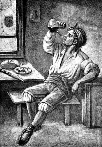 | Lám. V, Figs. 7 y 8.— Para quienes gusten de estas bagatelas, reproducimos aquí dos acuarelas encontradas rebuscando entre mis viejos papeles. Fueron ejecutadas de memoria, cuando yo tenía nueve o diez años, poco después de la época del desahucio del revocador. Ambas, sobre todo la primera, ofrecen ostensibles defectos de dibujo y proporciones. Una de ellas representa cierto labriego de Ayerbe bebiendo en la taberna; la otra reproduce la ermita de la Virgen de Casbas, en los Anguiles, cerca de la citada villa. | 54 |