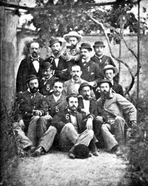 | Lám. XIV, Fig. 22.— Esta fotografía, efectuada por mí por el proceder del colodión (1873), poco antes de ingresar en el ejército, presenta algunos de mis condiscípulos y amigos, casi todos fallecidos ya.—1, C. Senac; 2, Simeón Pastor (que fué catedrático de Terapéutica); 3, Visié (que fué médico militar); 4, H. Gimeno Vizarra; 5, Félix Cerrada (actualmente catedrático de Patología general); 6, Hilarión Villuendas (ayudante del Museo); 7, Joaquín Benedicto (profesor que fué de la Escuela de Comercio); 8, Joaquín Vela (después médico militar y compañero en Cuba). | 256 |