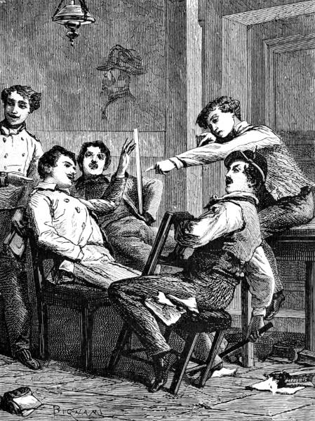 I primi e più cari amici gl'incontrai a diciassett'anni, in un superbo palazzo, che ho sempre dinanzi agli occhi, come se ne fossi uscito ieri. Vedo i grandi cortili, i grandi portici, le sale ornate di colonne, di statue e di bassorilievi; e in mezzo a queste cose belle e magnifiche, che richiamano al pensiero la reggia antica, lunghe file di letti, di banchi di scuola, di panni appesi, di fucili, di daghe. Cinquecento giovani sono sparsi pei cortili, per gli anditi, per le scale; un sordo rumore, interrotto da grida acute e da risate sonore, si spande fino ai più lontani recessi del vasto edifizio. Che movimento! Che vita! Che varietà di tipi, di atteggiamenti, di accenti! Giovani dalle forme atletiche con lunghi baffi irsuti e voci stentoree, giovanetti smilzi e gentili come fanciulle; [12] visi bruni ed occhi siciliani nerissimi, e capigliature bionde e pupille azzurre del settentrione; gesticolìo concitato di Napoletani, vocìo argentino di Toscani, parlantina accelerata di Veneti, cento crocchi, cento dialetti; di qua canti e conversazioni clamorose, di là corse, salti e battimani; gente d'ogni ceto, figliuoli di duchi, di senatori, di bottegai, di impiegati, di generali; una società bizzarra che ha un po' del collegio, del convento e della caserma; dove si parla di donne, di guerra, di romanzi, di regolamenti; dove si fanno pettegolezzi da donnicciuole e si covano segrete ambizioni virili; una vita piena di noie mortali e d'allegrezze sfrenate, una confusione di sentimenti, di faccende e di casi dolorosi, stravaganti e amenissimi, da cui la penna di un grande umorista potrebbe cavare un capolavoro.