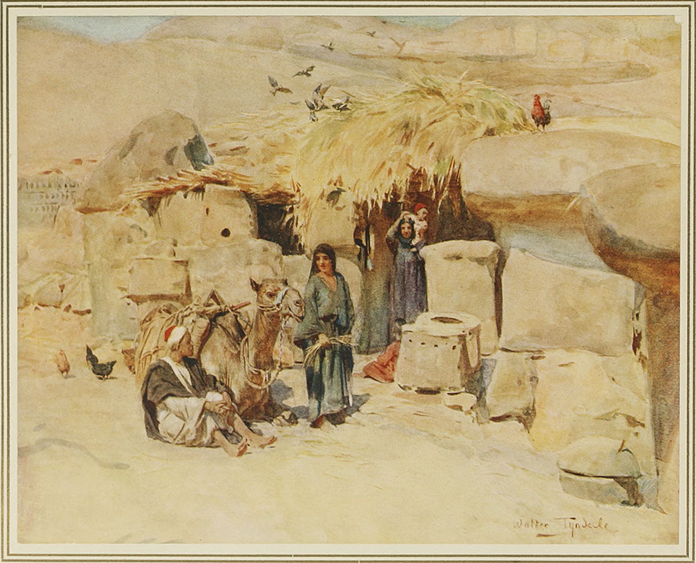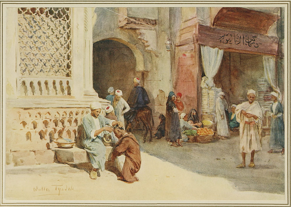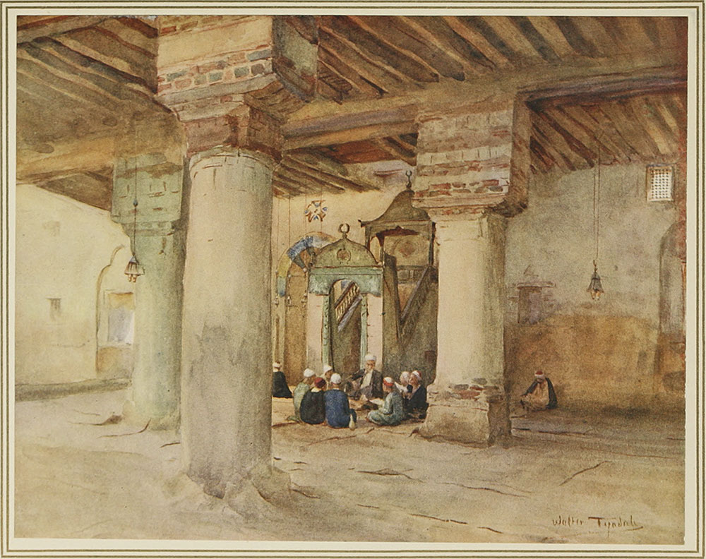 I returned to the mosque to start my drawing, and remained there until it was time to join our tea-party at the camp. Two or three men dropped in during the midday prayer, but the caretaker beckoned to me not to move my easel. Some boys arrived later on and sat around an old sheykh who expounded the Koran to them.