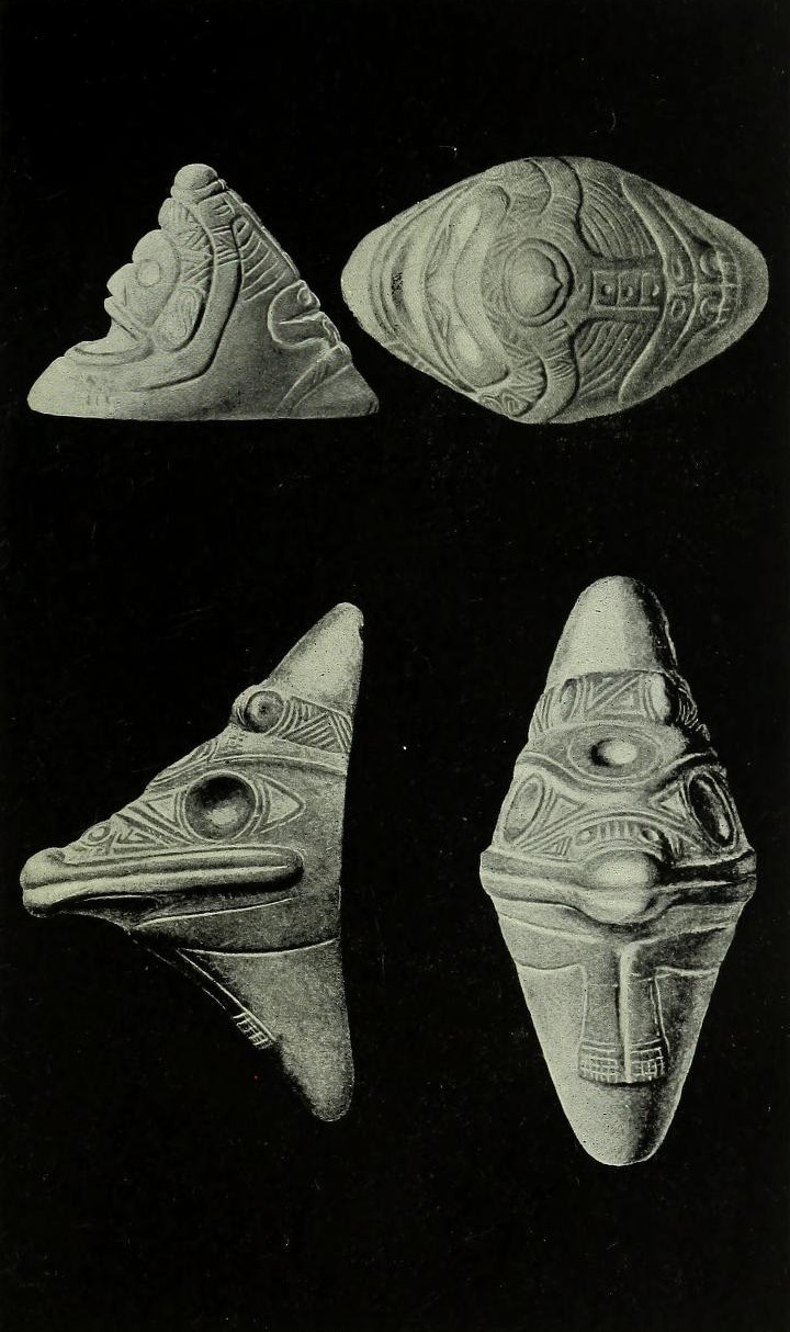 The work of archaeologists, especially in the Greater Antilles, has brought to light many curious objects certainly connected with the old Antillean cults. There are idols and images, ranging in height from near three feet to an inch or so; and the latter, often perforated, were used, perhaps, as Peter Martyr describes: "When they are about to go into battle, they tie small images representing little demons upon their foreheads." There are, again, masks and grotesque faces, sometimes cunningly carved, sometimes crude pictographs. Most characteristic are the triangular stones with a human or an animal face on one side; the stone collars or yokes, some slender and some massive in construction, but all representing laborious toil; and the "elbow stones" with carved panels—objects[Pg 24] of which the true use and meaning is forgotten, though their connexion with cult is not to be doubted.[14] Possibly a hint of their meaning is to be found in the narrative of Columbus, which, after describing the zemis, goes on to say: "Most of the caciques have three great stones also, to which they and their people show a great devotion. The one they say helps corn and all sorts of grain; the second makes women be delivered without pain; and the third procures rain and fair weather, according as they stand in need of either."