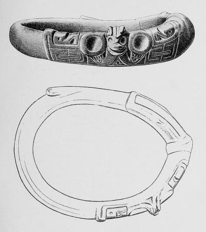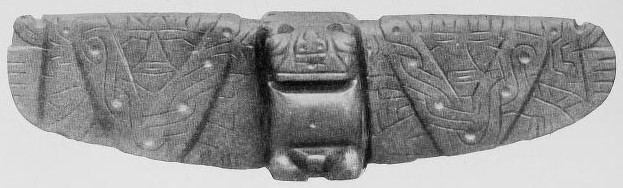 Antillean stone ring, of the ovate type, with carved panels. Stone rings, or "collars," form one of the types of symbolic stones from this region the significance of which has so profoundly puzzled archaeologists. Reference to their possible meaning will be found on page 24 and note 14. there referred to. The specimen here figured is in the Museum of the American Indian, New York. Joyce (Central American Archaeology, pages 189-91) interprets the design as a human figure. The disks on either side of the head are ear-plugs; arms and hands may be seen supporting them; the pit between the elbows is the umbilicus; while the legs are represented by the upper segments of the decorated panels exterior to the disks.