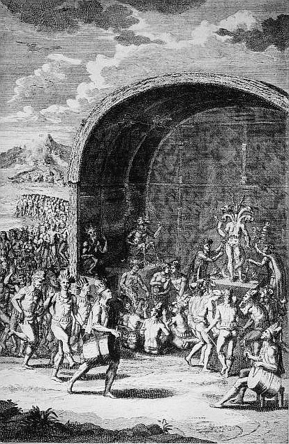 In such descriptions we get our picture of zemiism, a religion rising above the animism which was its obvious source, becoming predominantly anthropomorphic in its representations of superhuman beings, yet showing no signs of passing from crude fetish-worship to that symbolic use of images which marks the higher forms of idolatry. The ritual was apparently not bloody—offerings of tobacco, the use of purges and narcotics inducing vision and frenzy, and the dramatic dances, or areitos, which marked all solemn occasions and the great seasons of life, such as birth and marriage and death—these were the important features. Oblatio sacrificiorum pertinet ad jus naturale, says Las Casas (quoting St. Thomas Aquinas) in his description of Haitian rites; and to the law of man's nature may surely be ascribed that impulse which caused the Antillean to make his offerings to Heaven and Earth and to the powers that dwell therein.
