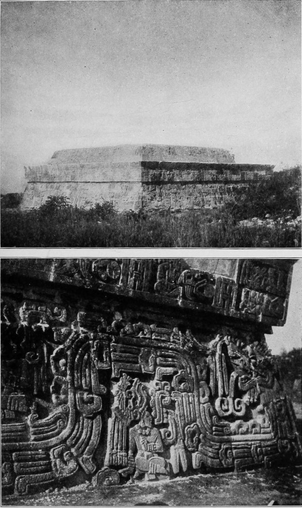 Top face of the monolith known as the "Dragon" or the "Great Turtle" of Quirigua. This is one of the group of stelae and "altars" which mark the ceremonial courts of this vanished Maya city (see Plate XXIII); and is perhaps the master-work not only of Mayan, but of aboriginal American art. The top of the stone here figured shows a highly conventionalized daemon or dragon mask, surrounded by a complication of ornament. The north and south (here lower and upper) faces of the monument contain representations of divinities; on the south face is a mask of the "god with the ornamented nose" (possibly Ahpuch, the death god), and on the north, seated within the open mouth of the Dragon, the teeth of whose upper jaw appear on the top face of the monument, is carved a serene, Buddha-like divinity shown in Plate XXV. The Maya date corresponding, probably, to 525 a. d. appears in a glyphic inscription on the shoulder of the Dragon. The monument is fully described by W. H. Holmes, Art and Archaeology, Vol. IV, No. 6.