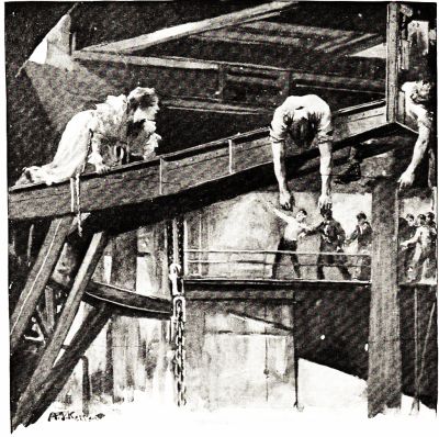 There was a lifting trembling quiver that caused both the unwilling passengers to hold on tighter, if possible, than before, and all at once there was a crash that almost took out their arms. They had reached the end of the track, but they did not stop. Oh no! As a stone skips off the surface of a mill-pond they left the earth, with a sickening upward swoop that almost stopped their hearts. On and on, higher and higher, with a roaring whirring sound in their ears, and then apparently they reached a height where for a few moments, as Billy afterwards put it, they "kept an even keel." But it was not for long. There was a dip forward, and down they swooped at even greater speed than they had ascended. Gibb began to scream now, and, fell flat, with his arms about the upright and his legs, spread out, clawing with his toes to keep himself from slipping. Billy lost his balance too, and reaching up his hand, caught one of the stays. Instantly there was a great rush of air, a checking of the downward motion, and, as Gibb put it, they "scooped" up again. Maybe the two boys had become more used to this nightmare sort of motion by this time, for they were lying with their faces looking over the side. Far below them they could see the dark shadow that they knew was ground, and little twinkling lights that they knew were houses. Some brilliant-colored fireworks burst in the air beneath them. For some five or ten minutes they kept on a level, and for the first time found a chance to indulge in conversation.