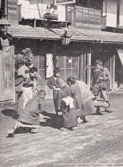 Some of the streets were almost impassable because of the number of beautifully dressed girls who were playing battledore and shuttlecock. The air was full of the bright fluttering toys as they were struck from one player to the other, and the silver world was a very merry place as Umé rode swiftly toward her home.