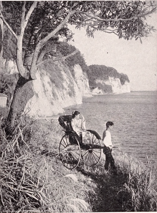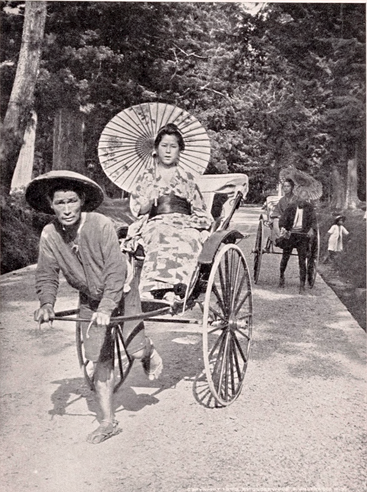 His jinrikisha was waiting at the garden gate. In their place on the flat stone at the house entrance stood his wooden clogs, and all the family gathered at the door to bid him "Sayonara."