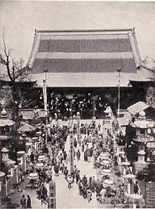 Umé and Maru went reverently through all the ceremony of washing the hands and mouth, ringing [pg 116] the bell, dropping the offering of coins in the box and buying the rice-cakes. They left their clogs at the entrance among several other pairs, for many sad hearts had come to the temple with petitions on this early morning of the New Year.
