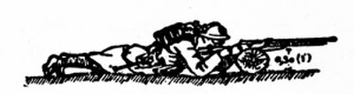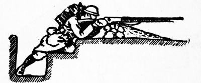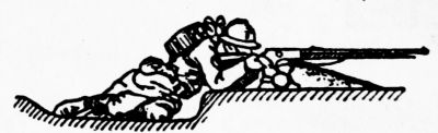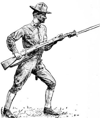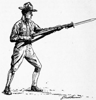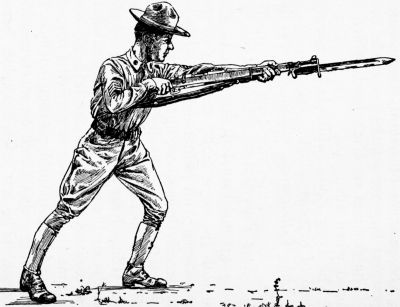 Being in the prone position at the starting point the soldier rises quickly to his feet and advances at the double time (not running) towards Target No. 1, the piece being carried at the "High Port." When within about 8 paces of Target No. 1 the piece is brought to the position of guard and when at the proper distance the target is attacked with a vigorous "Long Point." This is followed by a clean withdrawal.