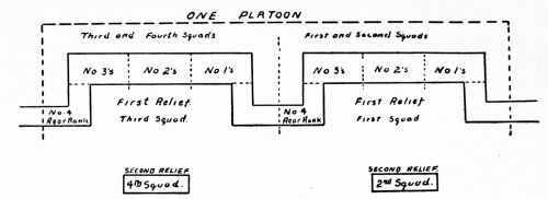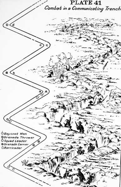 After the men have been taken through a thorough course of training in the individual instruction, problems should be devised in which a squad assaults a section[Pg 225] of the trench system under the direction of the squad leader. This is followed by exercises conducted by the platoon leader, the strength of the platoon being as many squads as can be employed at one time on the front of the section of trench system available.
