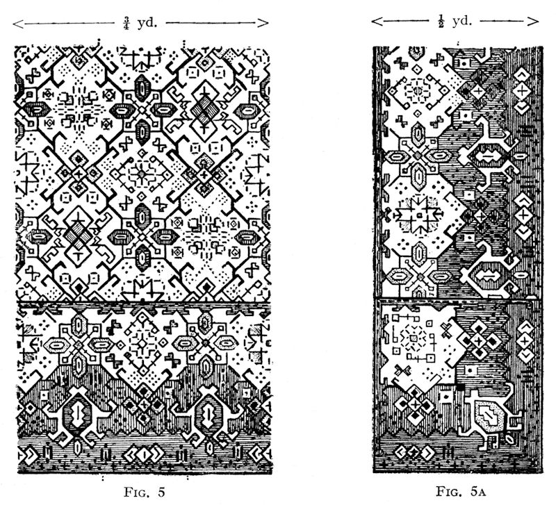 The use of a woven floor-covering seems to be indicated in passages in Homer; and the well-known authority, Sir George Birdwood, cites an account of a banquet given at Alexandria in the third century before the Christian Era by Ptolemy Philadelphus, at which Persian rugs were spread in the King’s tent. Persian carpets were highly valued, and were exported to Greece, and at a later date to Rome. Themistocles, according to Plutarch, “likened a man’s discourse to a rich Persian carpet, the beautiful figures and patterns of which can be shown only by spreading and extending it out; when it is contracted and folded up, they are obscured and lost.”