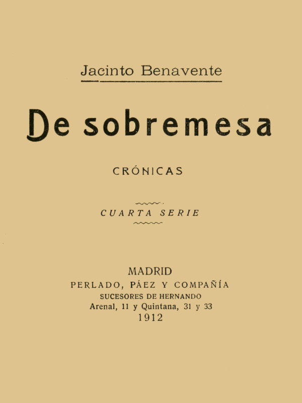 Y era cuanto yo quería decir en el día del triunfo, que yo no llamo definitivo, al autor de Canción de cuna. Y sabed, mi amigo de siempre, que una buena lágrima que tal vez visteis asomar á mis ojos al abrazaros después del estreno de vuestra obra, venía de más lejos que de la emoción causada por la obra misma: venía de muchos recuerdos, de muchas palabras calladas, de aquel vuestro primer libro, de aquella vuestra timidez de niño, y, ¿por qué no decirlo?, del orgullo de que, cuando para muchos se estrenaba en aquella noche Canción de cuna, para mí se había estrenado hace mucho tiempo.