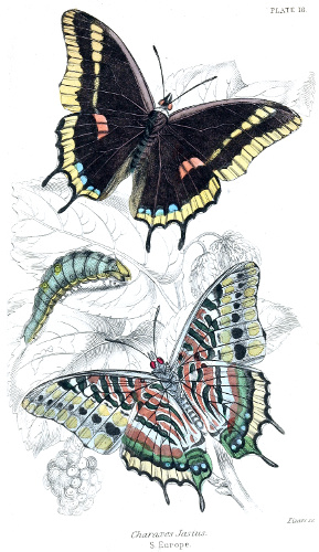 As already mentioned, Urania is distinguished from all other groups, except Thaliura, by the shape of the antennæ, and an obvious character for separating it from that is the presence of only a single tail. The palpi are short and project a little beyond the head, the terminal joint being nearly naked. The tibiæ of the anterior legs are furnished with spines in the middle; and the claws are minute. When at rest the anterior wings are kept in a horizontal position, or but slightly turned upwards, one peculiarity among many others in which they resemble the nocturnal lepidoptera. We are indebted to Mr. Macleay for an account of the metamorphoses of a species which he has named U. Fernandinæ, but which is probably synonymous with some previously known. The caterpillar feeds on a kind of Omphalea which grows abundantly on the sea-coast of Jamaica. It never appears during the heat of the day, but reposes in a torpid state within a thin transparent web on the under side of the leaves, in order to avoid the rays of the sun. Its only time of feeding is during the night. In its appearance and habits it shows more affinity to the larvæ of the Bombycidæ than to the diurnal Lepidoptera. When about to change to a chrysalis 201 it spins an oval cocoon of yellow silk, the meshes of which are so lax as to allow the inmate to be easily seen. The pupa is not at all angular. “The perfect butterfly,” he adds, “is perfectly diurnal, and very swift in its flight. It is not found in the interior of the island, but it may be seen in plenty as far as two or even three leagues from the coast, sporting in the sun, and sucking the flowers of Cestrum diurnum, Ehretia tinifolia, and other odoriferous trees of small stature. In hot weather and about mid-day it flies particularly high, and may be even observed surmounting the tops of the highest members of the forest. In the afternoon I have often seen it sport about some capriciously chosen spot, such as a particular branch of Mango, where it would always return to alight on almost the same leaf, in a manner that has sometimes reminded me of a well known habit of the Musicapæ. Thus does our insect spend whole hours until sunset, when the bats usually terminate its diversion and its life. On the approach of winter it may be seen at times alighting on hedges, when specimens are more easily captured. The flight, however, of U. Fernandinæ is always strong, and it starts like the Fringillidæ. When it alights on a leaf, all the four wings are expanded horizontally; and rarely, if ever, take a vertical position, like those of the species of the Linnæan genus Papilio, when at rest38.” 202