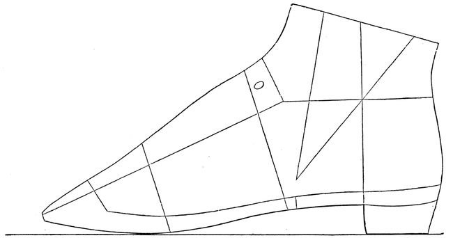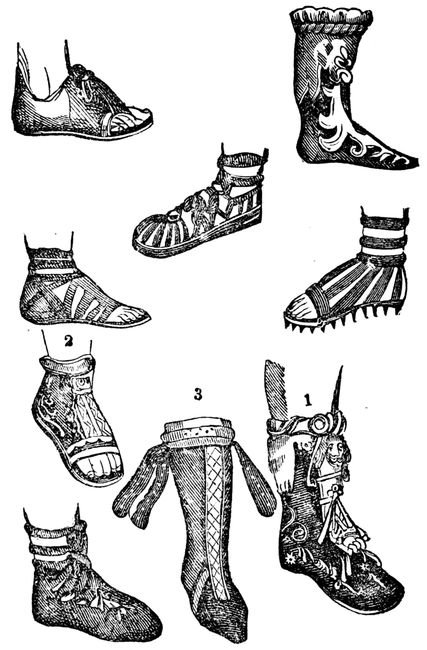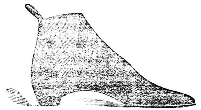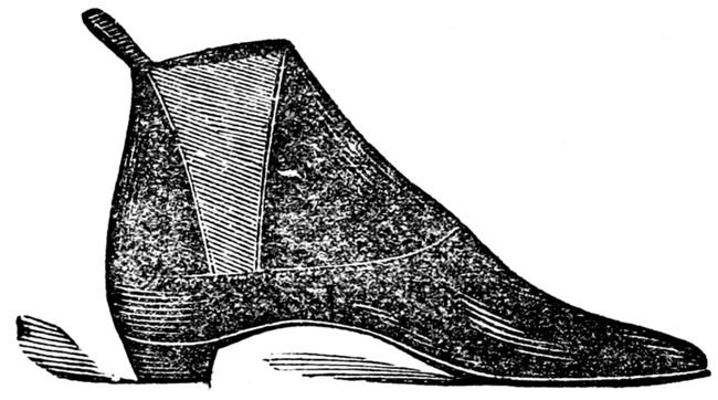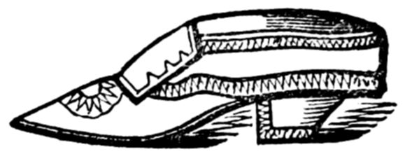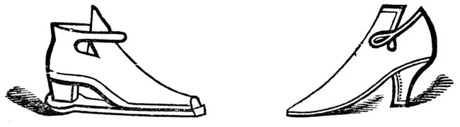 The first attempt, of which we have any account, to give style to the coverings of the feet, produced the Sandal. These differed in style, though slightly varied in form. Those used by the poorer classes were constructed of flat slices of the palm leaf, which, lapped over in the centre, formed the sole, and a double band of twisted leaves secured and strengthened the edge; a thong of the strong fibres of the same plant was affixed to each side of the instep, and was secured round the foot, while those indulged in by the more wealthy classes were made of leather, and were frequently lined with cloth, the point or end turning up like a pair of modern skates. The sandal reached its greatest perfection among the Romans. The emperor Aurelian gave the royal permission to the ladies of his time to wear sandals of various colors, the men not being permitted to indulge in so great a luxury. The Roman senators wore buskins of xvia black color, with a crescent of gold or silver on the top of the foot, while the soldiers wore simple sandals fastened by thongs. In the reign of Edward the Third, of England, those who worked at the shoe trade, were denominated the “gentle craft,” as they produced shoes of the most gorgeous description, the richest contrasts of color were elaborated and the greatest variety of pattern devised.