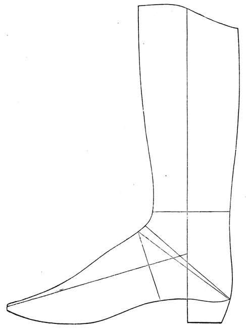 The accompanying cut will furnish an idea of the amplitude of the tops. The boot is adorned with lace around the upper part, and that portion of the boot into which the leg is inserted was fitted with pliant leather; over the instep is a broad band of leather, beneath which the spur was fastened.