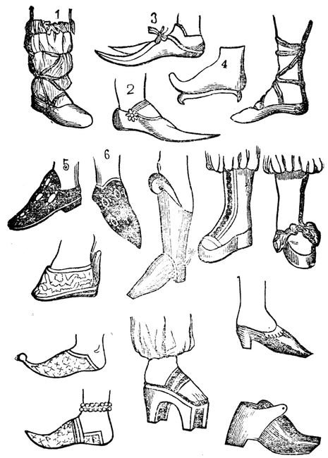 No. 1 is the sandal of a Russian lady of 1768. The second that of a female of Finland, a low, slipper-like shoe, secured by a band across the instep, having an ornamental clasp, like a brooch, to secure it on each side of the foot; it was probably a coarsely made piece of jewelry, with glass or cheap stones set around it, as the people of this country at that time were fond of such showy decorations, particularly upon their shoes. xxNo. 3 is a production of the same country, and is similar to those worn by the matrons of the upper classes. No. 4 is the shoe of a Tartarian lady of 1577. Nos. 5 and 6 are examples of the shoes of oriental ladies, which are sometimes highly ornamented; the covering part being wrought with gold, silver, and silk, and perhaps set with jewels, real or imitated. The shoes of noblemen are of similar construction. They were no doubt easy to wear.