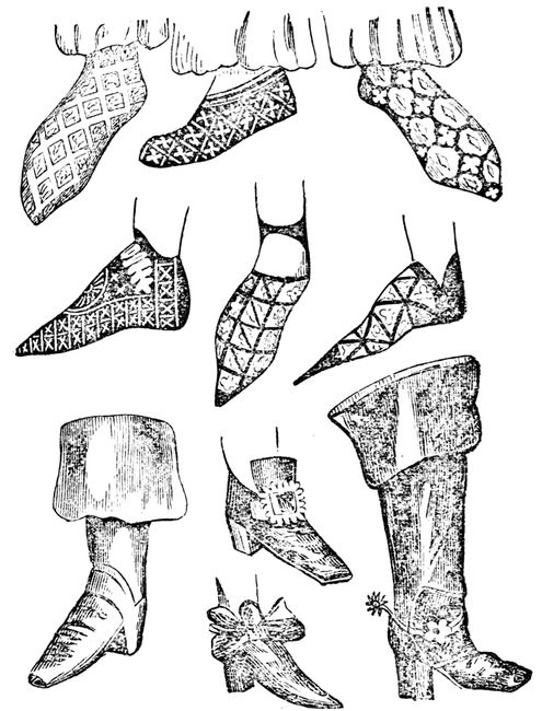 Coming down to the reign of Richard II., boots and shoes were made of great length, so that they were chained to the knee of the wearer, that he might walk with some degree of freedom. Of course, only the nobility could afford so expensive a method of locomotion. Extremes were introduced from time to time, as in our own day. During the reign of Edward III., it was enacted that any shoemaker working for the “unprivileged classes,” should not make any shoes, the toes which should exceed two inches in length, under a penalty of twenty shillings. This edict had the effect to widen the toes to a most absurd extent; this fashion was followed by a proclamation from Queen Mary, that the width of the toes should not exceed six inches.