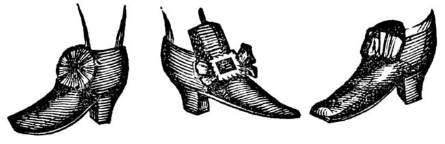 The clog beneath the shoe on the left side, was simply a piece of stout leather, evidently intended to protect the feet from excessive moisture. The distinguishing xixmark of gentility in the reign of George I. and II., was red heels. The ladies preferred silk or velvet to leather, and the favorite shoe worn by the ladies of the court were made of figured blue silk with bright red heels and silver buckles.