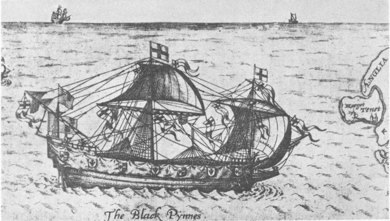 A pinnace used in the funeral of Sir Philip Sidney, 1587. Small boats such as this were used to transport men and supplies from the harbor at Hatoraske through the inland waters to Roanoke Island.