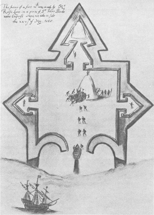 John White’s water-color drawing of the fort which Ralph Lane built in Puerto Rico in May 1585 while the first group of colonists were en route to Roanoke Island.