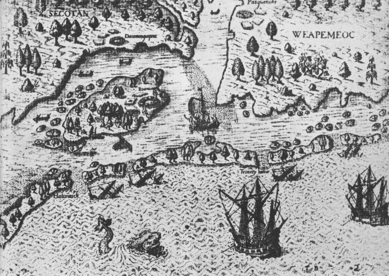 “The Arrival of the Englishmen in Virginia,” engraved by Theodore de Bry from one of John White’s drawings. The view is toward the west, and Dasamonquepeuc is shown on the mainland west of the north end of Roanoke Island.