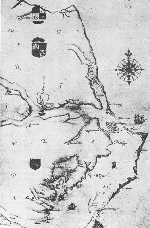 The fleet, consisting of three ships, sailed from Plymouth for Virginia on May 8. Continuity with the previous expeditions was afforded in the persons of the Governor, John White, who was to make in all five trips to Virginia, Simon Ferdinando, Captain Stafford, Darby Glande, the Irishman, and perhaps others. The route, as in 1585, lay via “Moskito Bay” in Puerto Rico. Here Darby Glande was left behind, or escaped, and lived to testify regarding the first Roanoke Island colony before the Spanish authorities at St. Augustine some years later. The expedition sailed along the coast of Haiti, even passing by “Isabella” where Grenville had traded with the Spaniards for cattle and other necessities in 1585, but this time there was no trading, possibly because of the precarious relations between England and Spain, now on the eve of open 21 war. Whatever the reason for this failure to take in supplies in Haiti, it constituted a certain handicap for the colony of 1587.