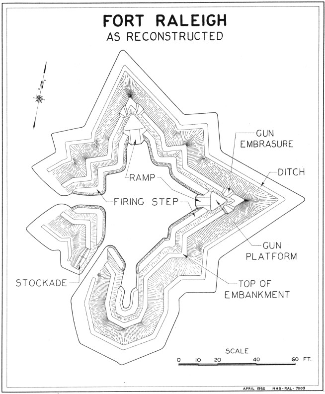 The historic object of chief interest at Fort Raleigh is the fort built by Ralph Lane during 1585-86 and called by him “the new Fort in Virginia.” As the settlers of the Lost Colony of 1587 are known to have rebuilt for their own use the houses which Lane’s men constructed about the fort, it may be safely assumed that this same fort served them also for a time, at least until they found it necessary to erect the great stockade made of tree trunks that Governor White found enclosing their settlement area in 1590.