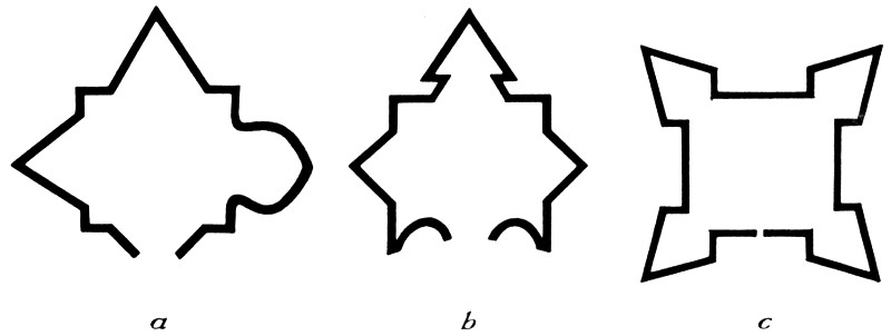 Comparisons of the fort on Roanoke Island with other forts of the period. (a) The fort on Roanoke Island; (b) the fort built in Puerto Rico by Ralph Lane; (c) a conventional fort with corner bastions.