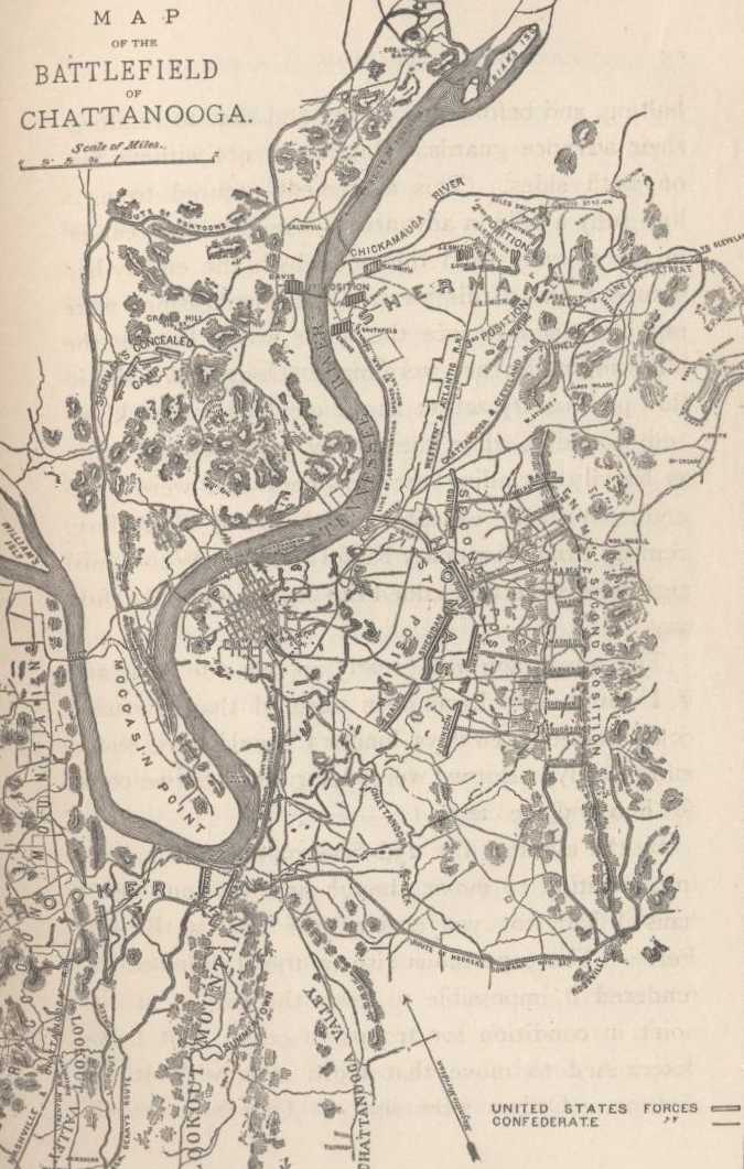 Chattanooga is on the south bank of the Tennessee, where that river runs nearly due west. It is at the northern end of a valley five or six miles in width, through which Chattanooga Creek runs. To the east of the valley is Missionary Ridge, rising from five to eight hundred feet above the creek and terminating somewhat abruptly a half mile or more before reaching the Tennessee. On the west of the valley is Lookout Mountain, twenty-two hundred feet above-tide water. Just below the town the Tennessee makes a turn to the south and runs to the base of Lookout Mountain, leaving no level ground between the mountain and river. The Memphis and Charleston Railroad passes this point, where the mountain stands nearly perpendicular. East of Missionary Ridge flows the South Chickamauga River; west of Lookout Mountain is Lookout Creek; and west of that, Raccoon Mountains. Lookout Mountain, at its northern end, rises almost perpendicularly for some distance, then breaks off in a gentle slope of cultivated fields to near the summit, where it ends in a palisade thirty or more feet in height. On the gently sloping ground, between the upper and lower palisades, there is a single farmhouse, which is reached by a wagon-road from the valley east.