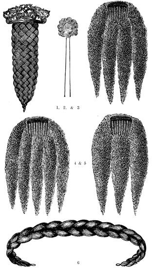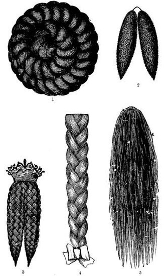 1. Seven Strand Plait, with Fancy Comb attached. 2. Pin Curl. These curls are generally made upon hair-pins, for which a small quantity of short frizzed, or curled hair, suffices. 3, 4, & 5. Human Hair Frizzetts, for plaited Chignons, Plicaturas, &c. 6. Long Plait, for a coiled Chignon when made upon the head.