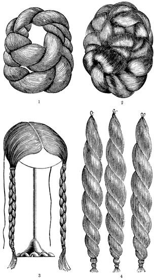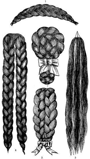 “But let us follow M. Denizet, the author of a remarkable work on ‘Waste Hair,’ in these developments,” continues M. Bouchard. “This writer tells us that the plaits or small chignons, and which are consequently cheap, weigh from 60 to 80 grammes, and that in every one of them there is contained hair from more than two hundred persons. The following is their origin and 11manufacture. In the issues of the toilet of these two hundred women of all ages and stations, the hair of the middle-class woman is first observed. These women are in the habit of rolling the combings over their fingers, then putting them into a small piece of paper, so that they do not fly away, and this hair is found in the sweepings of the house.... In the state in which the hair leaves the bag of the collector it seems good for nothing. People in general would not like to touch it, and yet of this refuse the cheap postiches are made which adorn the heads of persons who will not pay the price of hair cut off from the head.”