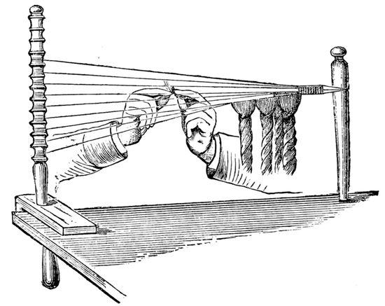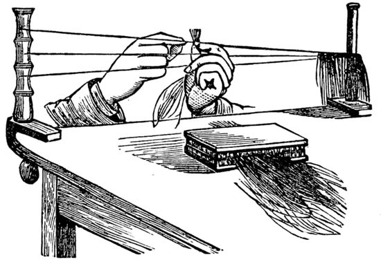 Hair of ten or twelve inches long is most suitable for making “inserted stems.” Tie up two strings as before described, and knot them together at the commencement, which is the starting-point in intertwining the hair. The hair itself should be placed within the drawing brushes as before; pull out thick “wefts,” and work them upon the strings as previously described, but with this difference, they are only to be crimped or crêped half way. Here is the mode of procedure—draw out a weft, and hold one half of the length in your left hand, while with the right you turn it over, and under, and between the strings in a methodical way, as I have previously mentioned. Push up each piece as it is worked, close and tight. Thus one half of the hair will be left hanging loose, while the other half when the operation is completed will be crêpé or crimped.