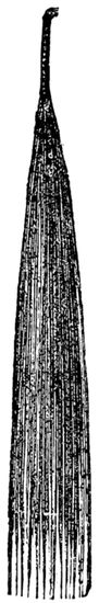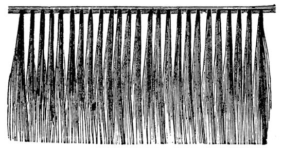 The hair can be dried either in the sun, in a warm room, or before a fire. If in the sun, and, of course, in the open air, each piece should 22be fastened separately to a line, and left to blow about in the wind for a few hours, or, in other words, till it is quite dry. If the drying process be carried on in a warm room, let the hair hang near to the ceiling, and avoid making a dust: but should an oven, or drying before the fire, be more convenient, turn the hair frequently, and mind it does not get scorched or burnt. Both these operations having been duly attended to, see that the “card” and “drawing-brushes” are perfectly clean, for the next process is that of drawing the hair.