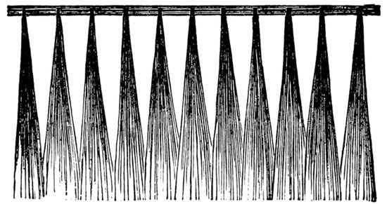 35When the crimped hair is required for use—and I allude to the making of ordinary frizzets first—cut the strings at convenient places and pull them out. Have a “card” and “drawing brushes” handy, and as each piece is carded, spread it upon one of the brushes by means of a dressing comb, and when conveniently filled put the other brush on the top, with a sufficiently heavy weight to keep it in its place. I need hardly say that the points are to be within the brushes, while the root-ends must be left projecting out a little way, as that will be found necessary and convenient. With reference to the longer hair which has been prepared for making the inserted stems, a similar course is to be pursued. The plain or straight ends are to be within the brushes, while the roots as in the previous case, are to be left free, say, to the extent of half an inch. Having arrived at this point, the next step is to weave the hair, and the method of doing so will be described in due course. I will remark here, however, that in weaving hair for frizzettes inserted stems, &c., all the wefts must not be set one way, as in the case when hair is woven for wigs, fronts, and curls, but each weft must be set in a contrary direction, i.e., one up and 36the other down. I shall be better able to describe this under the head of “Weaving,” of which it will be necessary to give an illustration.[4]